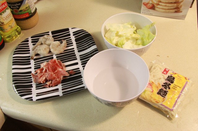 材料如上圖,火鍋肉片少許(要解凍)、高麗菜一盤、烏龍麵一份、冷凍蝦子少許、開水一碗。