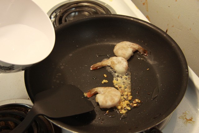 鼻子覺得夠香之後,先加入較難熟的冷凍蝦、高麗菜快炒,此時轉成大火,並加入少許開水。