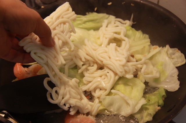 高麗菜大概7分熟之後,就可以加入烏龍麵囉!(我買的是已經熟的)