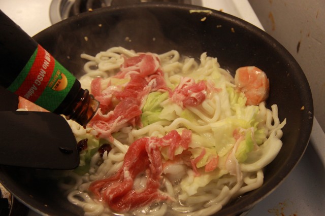 因為烏龍麵早就熟了,所以可以順便把肉片加下去。