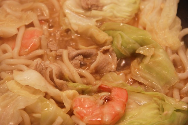 烏龍麵未下鍋就熟了、蔬菜就看個人喜好(要多脆)、肉片的話就像煮火鍋一樣,整片白了就好。